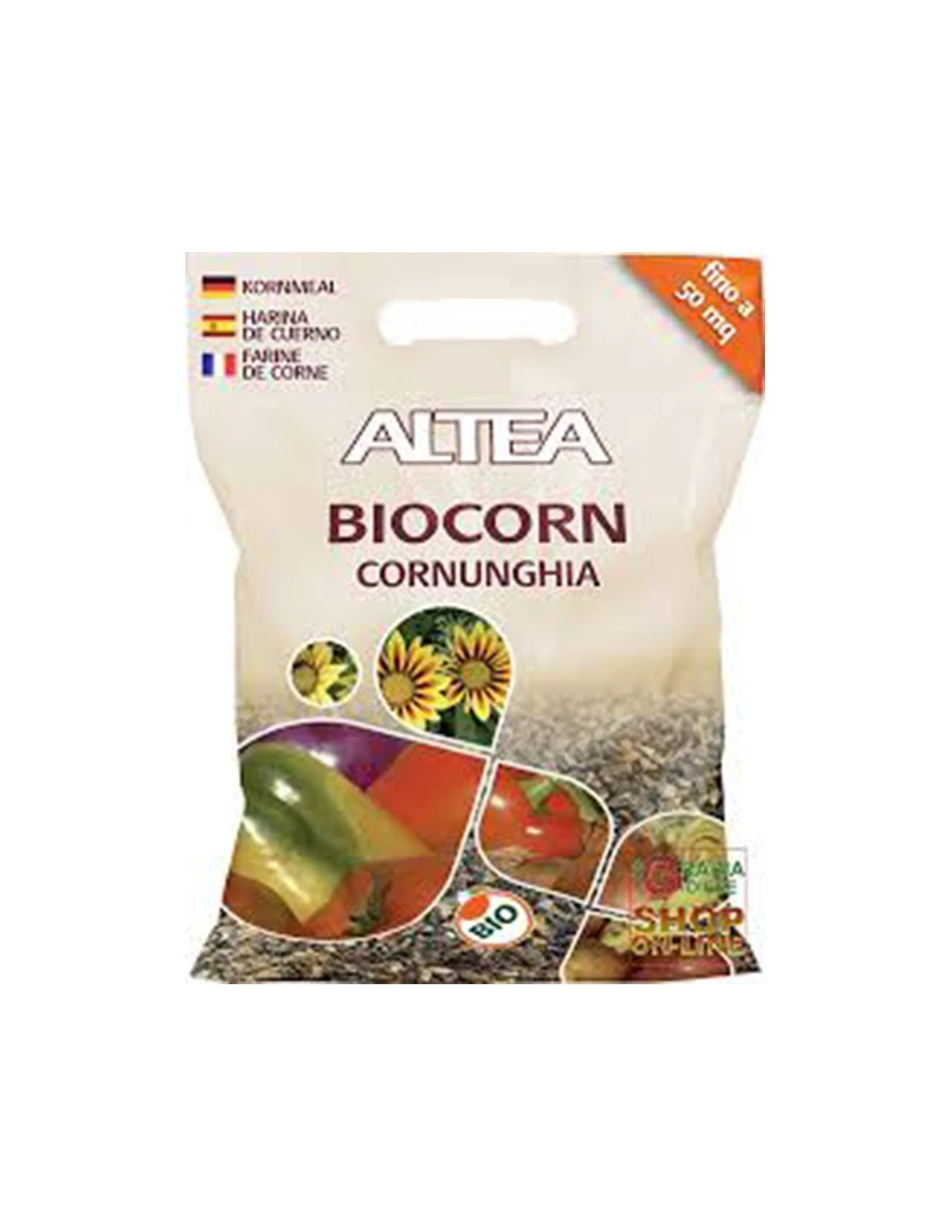 ALTEA BIOCORN è il concime organico azotato naturale a lento rilascio a maggior titolo in azoto organico (14%), è costituito esclusivamente da cornunghia naturale che viene ottenuta dalla sterilizzazione e frantumazione di corna e unghie di bovini, materiali ricchi in cheratine e con buoni contenuti in fosfati, potassio, magnesio e zolfo organico.
